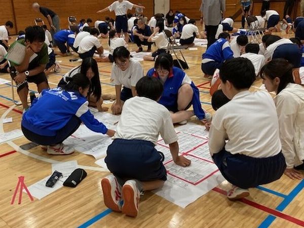 9月11日(火) 午後1時より一中体育館で2年生によるHUG(Hinanjo Unei Game)が行われました。生徒5~6人が1班となり合計30班が発生するさまざまな事案に対応するゲームです。
